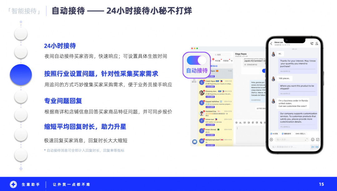 哪怕没有专业国际业务团队,普通工厂老板上传产品图片+参数,智能发品60秒生成多语种详情页;结合AI关键词优化、全球热搜趋势、客户标签分类,普通业务员也能像大外贸公司一样高效运营。AI客服全天在线,秒级响应技术参数、订单进度、售后咨询,帮团队降低失单率。AI谈判助手自动提示买家关注点、建议让利方案与配件增值,让报价更有针对性,提高转化率和复购率。